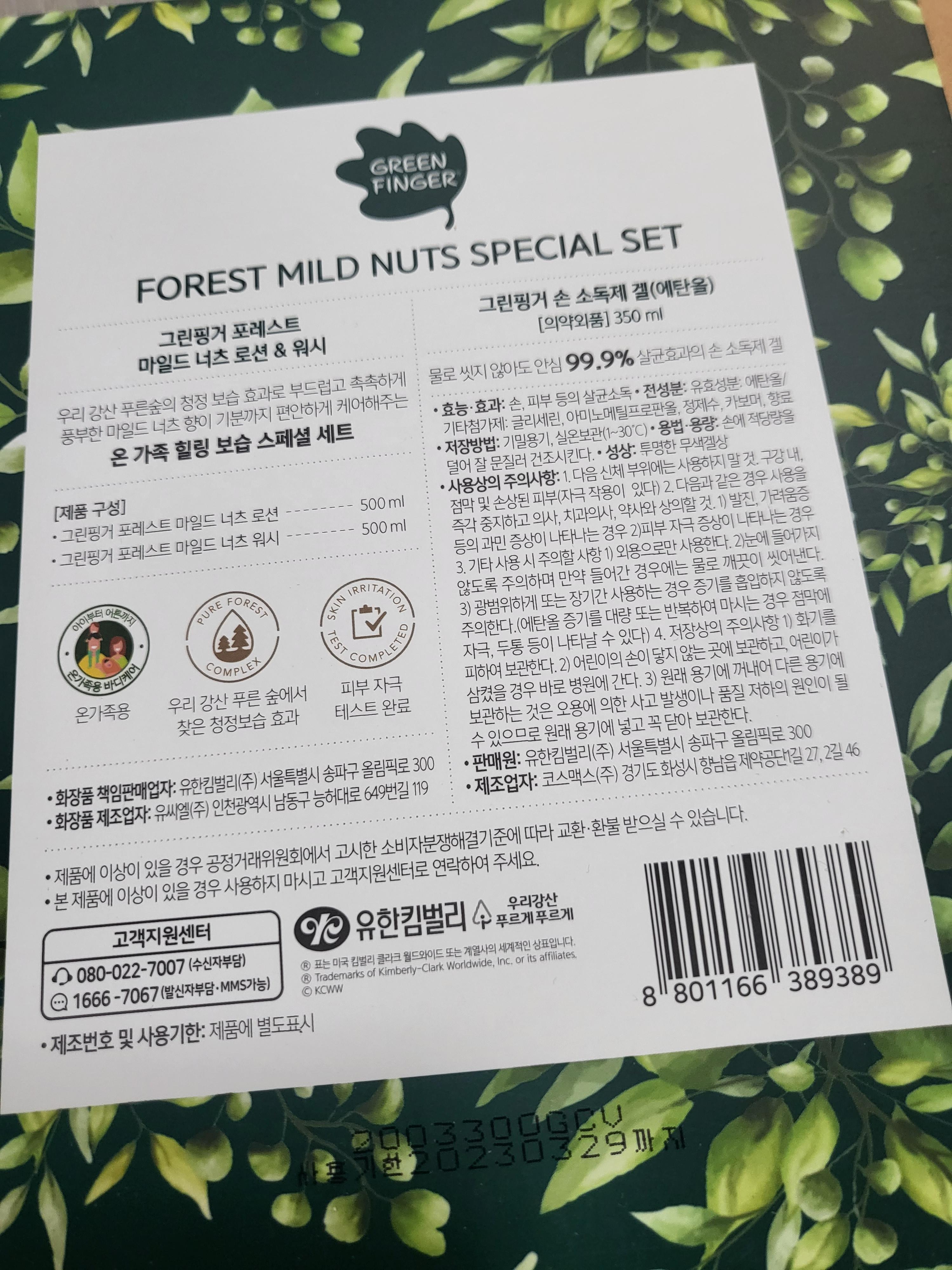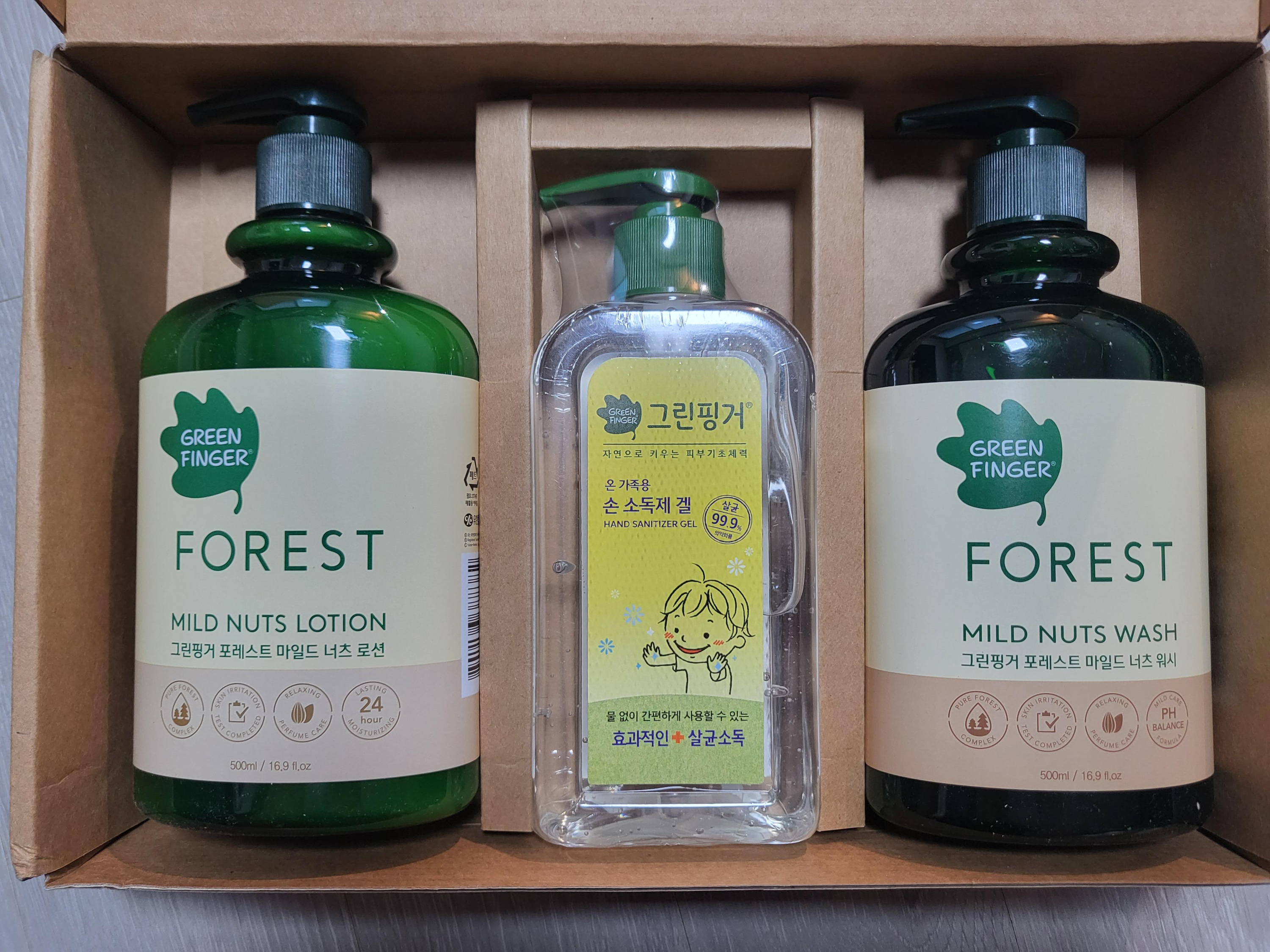 이렇게 구성품은 그린핑거 포레스트 마일드 너츠 로션과 워시, 그리고 손 소독제 겔 이 세트로 구성되어 있습니다.