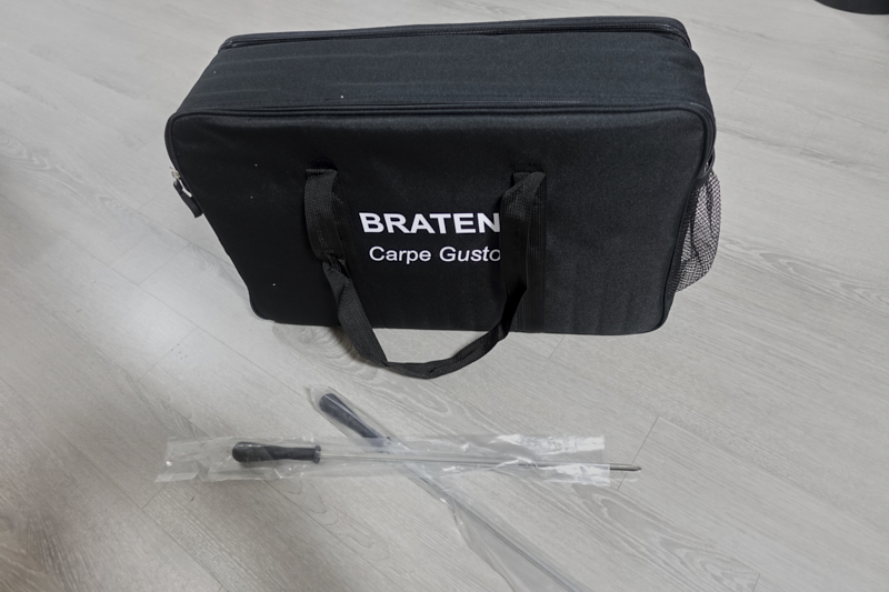 판매처에 따라서 다를것 같긴 하지만 제가 구매한 곳에서는 꼬치 2개를 함께 주고 있었습니다. 가방은 기본 구성품인듯 하고, 본체가 가방에 들어가 있습니다. 무게는 꽤 나가는 편입니다.