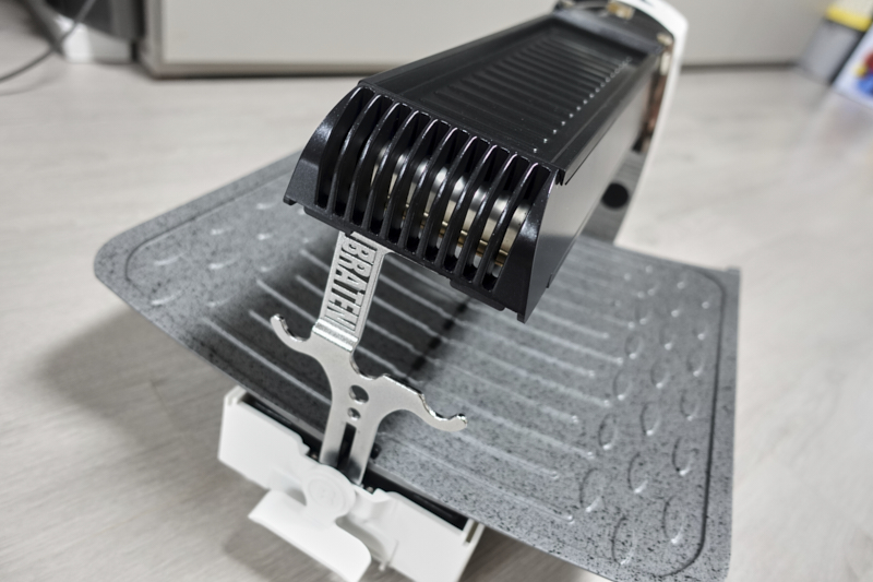 양쪽에 꽂혀있는 불판을 빼서 결합하면 고기 구울 준비는 끝납니다. 결합 자체도 홈이 잘 맞게 만들어져 있어서 크게 어렵지 않게 끼울수 있게 되어 있습니다.