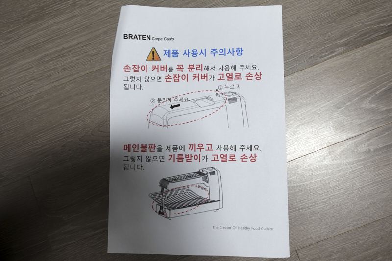 이건 브라텐 만의 주의사항이라기 보다는 불을 사용하는 모든 제품에 해당하는 것이겠는데, 특히나 직접 불을 사용하는 브라텐 가스그릴의 경우 뜨거운 곳이 많아서 함부로 만지다가는 화상을 입기 쉽습니다. 항상 조심해서 사용해야 합니다.