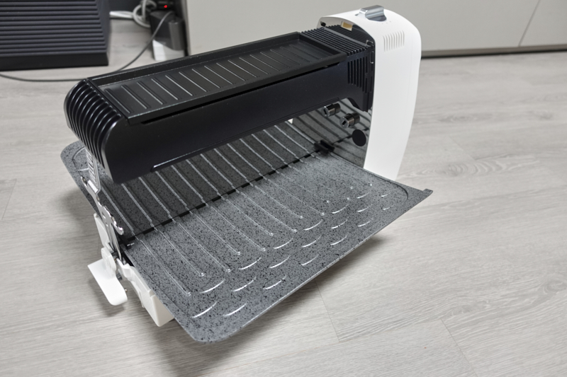 가정용 그릴은 야외에서 사용하는게 아니기 때문에 가장 중요한 조건이 있습니다. 바로 연기, 기름, 냄새 이 세가지를 잡는것이 중요한데요. 일반적으로 집에서 전부칠때 사용하는 전기그릴의 경우, 고기를 구워먹게 되면 (특히 돼지고기) 기름이 사방으로 튀어서 신문지를 깔고 굽거나, 사용후에 바닥을 소주로 닦아야 하는 경우가 종종 생기고는 합니다.