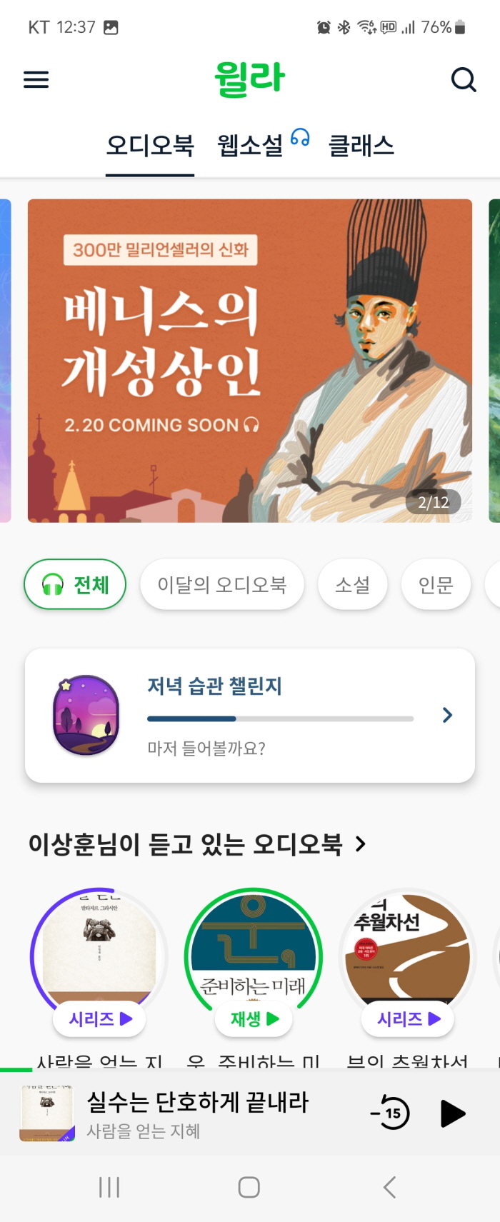 다양한 장점이 있는만큼 개인적으로 느낀 단점도 있는데요. 개인적으로 보는 행위보다는 듣는 행위가 집중력이 흐트러지기 훨씬 좋다고 생각하는데, 쉽게 생각해서 음악을 듣거나 하면서 딴생각을 하는 걸 생각해 보시면 좋을 듯합니다. 저만해도 오디오북을 듣다가 잠깐 딴생각을 하면 귀에서 들리는 책의 내용은 어느 순간 다 잊어버리고 딴생각에 빠져있는 경우가 있거든요. 물론 종이책도 읽다가 딴생각을 할 때가 있기는 하지만 그 빈도면에서는 오디오북이 집중하기가 더 어려운 점은 사실인 것 같습니다. 그리고 책장을 넘기는 행위 등이 없기 때문에 쉽게 잠에 빠져들 수 있다는 점도 있습니다 (이건 개인이 문제......) 또 하나의 단점은 오디오북의 단점이라기 보다는 윌라 오디오북만의 단점인데, 어플의 안정성이 너무 떨어집니다. 며칠에 한 번씩은 어플 접속이 되지 않거나 실행이 되지 않고, 삭제 후 재설치해봐도 접속이 안 되는 경우가 너무 자주 벌어집니다. 이러한 부분은 회사차원에서 개선이 필요할 듯싶습니다.