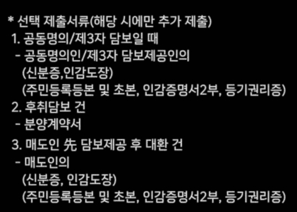 - 공동명의 / 제3자 담보일때 - 공동명의인 / 제3자 담보제공인의 (신분증, 인감도장) , (주민등록등본 및 초본, 인감증명서 2부, 등기권리증)