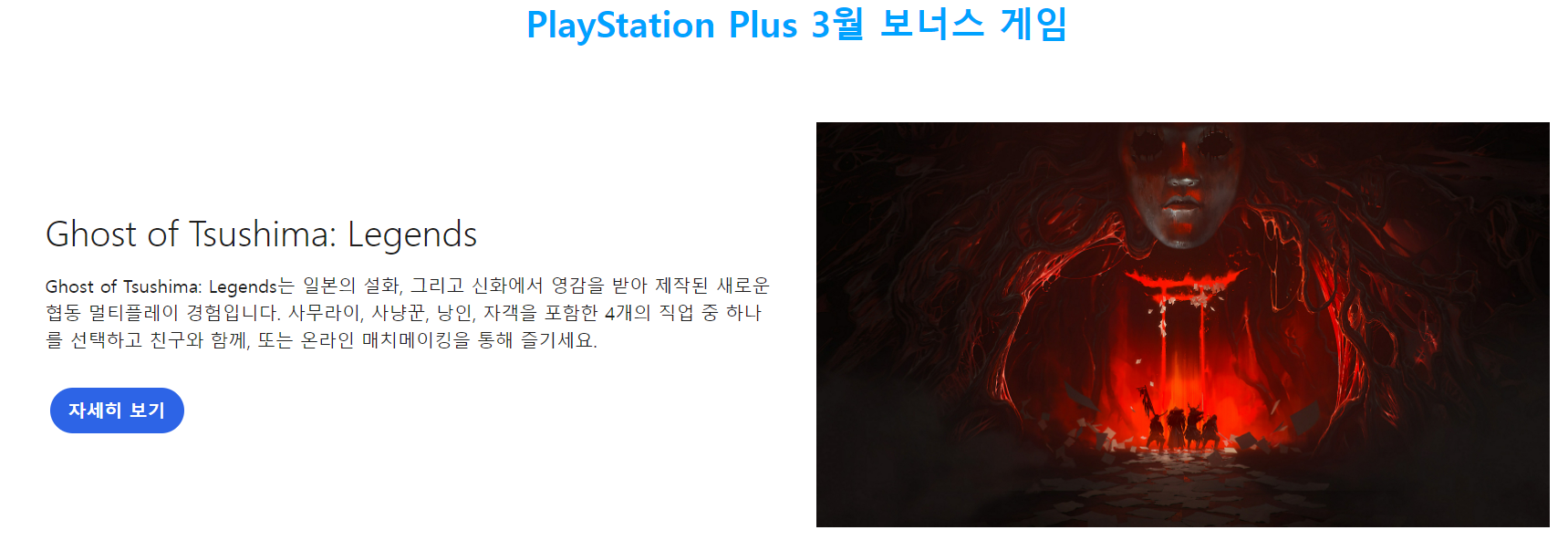 마지막으로 PS5 와 PS4 모두에서 즐길수 있는 3월 보너스 게임, 고스트 오브 쓰시마 레전드 입니다. 개인적으로 고스트 오브 쓰시마를 즐겁게 즐긴 기억이 있는데, 멀티플레이 전용 게임이라고 들었는데 재밌을까요?