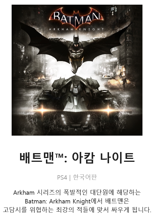 그 첫번째, 배트맨 아캄 나이트 입니다. 출시된지는 꽤 된 게임으로 기억하는데, 화려한 그래픽과 타격감을